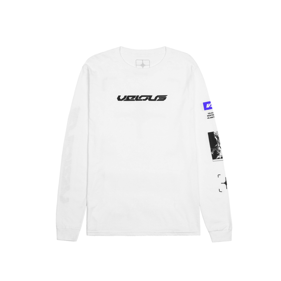 Made of cotton, this white long sleeve shirt features a futuristic Velours logo printed on the front, a classic target star logo in the back, the classic V20 block logo with a human MRI scan on the left sleeve and a futuristic Velours logo on the right sleeve.